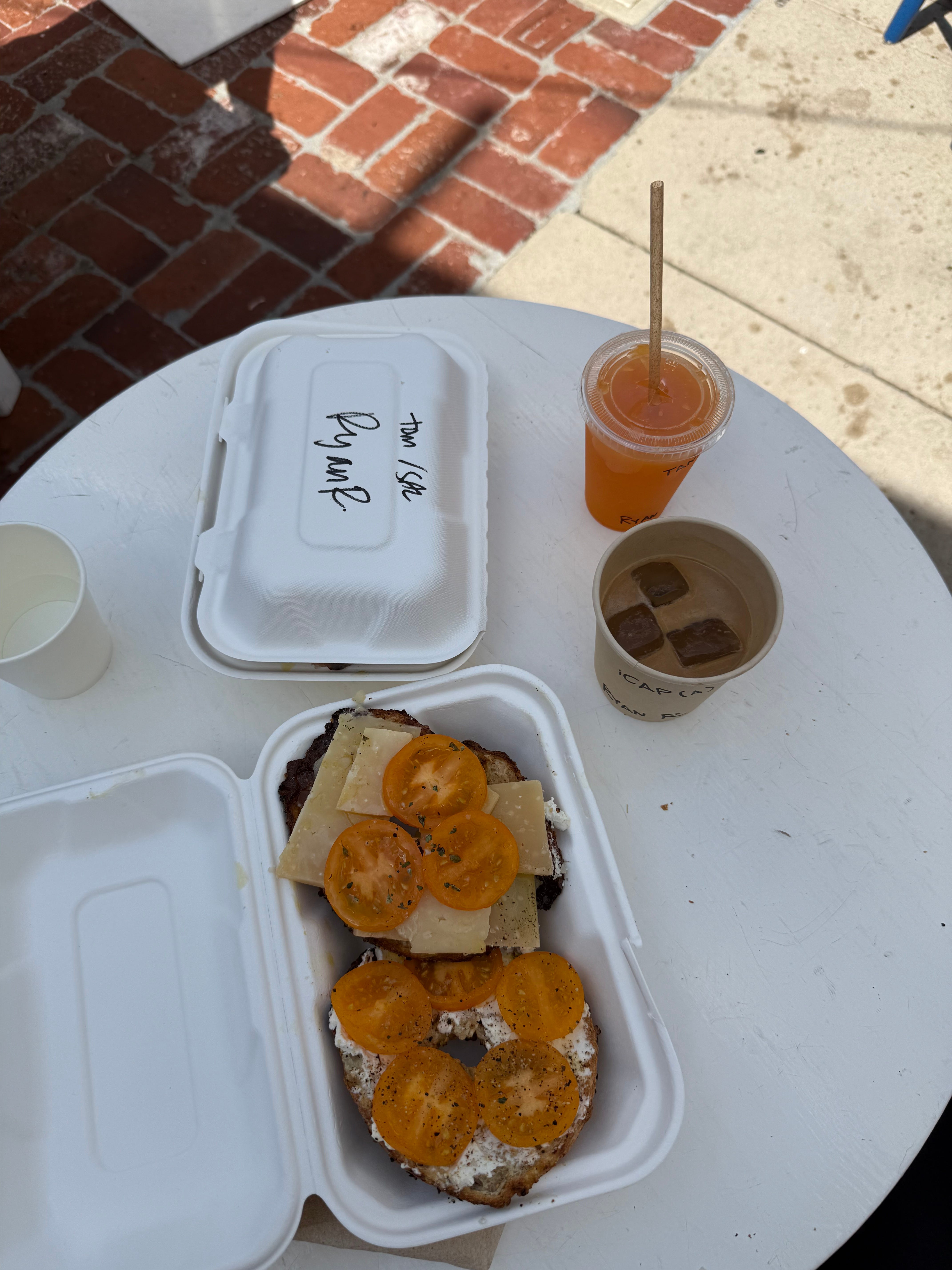 Last Saturday we had breakfast at Courage Bagels. My go-to is always tomato and cream cheese on a burnt everything bagel, and, if available, the cave cheddar on sesame. I’ll usually order an orange juice and an iced cappuccino if the day calls for it, otherwise hot, plus a crunchy almond jar to go.